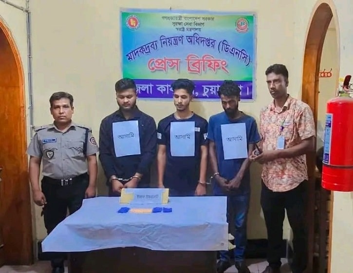 রবিবার বিকালে জেলা মাদকদ্রব্য নিয়ন্ত্রণ অধিদপ্তর এ অভিযান পরিচালনা করেন। গ্রেফতারকৃতরা হলো দামুড়হুদা উপজেলার দশমি গুলশান পাড়ার আনসার আলী মোল্লার ছেলে রাসেল মোল্লা পিন্টু (২৬), আসিকুর রহমান মিন্টুর ছেলে সবুজ (২৪) ও দামুড়হুদার দশমি পাড়ার তোফাজ্জল হোসেন মিন্টুর ছেলে জাহিদ হাসান (৩০)।