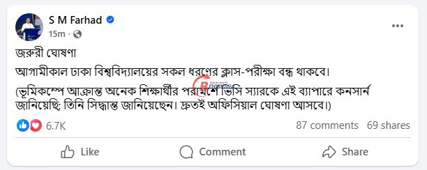 এস এম ফরহাদ তার পোস্টে বলেন, ‘আগামীকাল ঢাকা বিশ্ববিদ্যালয়ের সকল ধরনের ক্লাস-পরীক্ষা বন্ধ থাকবে।’