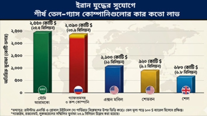 ইরান যুদ্ধের সুযোগকে কাজে লাগিয়ে বড় অঙ্কের অর্থ আয় করে নিচ্ছে বিশ্বের শীর্ষ তেল ও গ্যাস কোম্পানিগুলো। গত ২৮ ফেব্রুয়ারি যুদ্ধ শুরুর পর থেকে এক মাসে আরামকো, গ্যাজপ্রমের মতো কোম্পানিগুলো অতিরিক্ত দুই হাজার ৩০০ কোটি ডলার মুনাফা করেছে। আর এই মুনাফা আসছে সাধারণ মানুষের পকেট থেকেই।