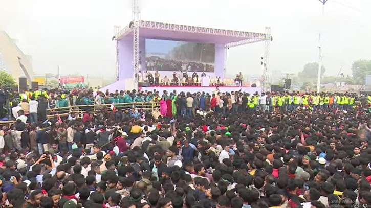 পরে বিমানবন্দরের আনুষ্ঠানিকতা শেষে তারেক রহমান সরাসরি রাজধানীর পূর্বাচলে পৌঁছান। সকাল থেকেই এই স্থানে বিপুলসংখ্যক বিএনপি নেতাকর্মী ও সমর্থকরা জড়ো হয়েছেন। তাদের অনেকেই গতকাল রাত থেকেই সেখানে আছেন। কেউ কেউ এলাকাভিত্তিক জটলা পাকিয়ে স্লোগান দিচ্ছেন, আবার কেউ সমবেতভাবে মিছিলে মুখর। এককথায় সবার মনেই উৎসবের আমেজ। এছাড়া স্লোগান-প্ল্যাকার্ড আর নেতাকর্মীদের উচ্ছ্বাসে পুরো এলাকায় উৎসবমুখর পরিবেশ বিরাজ করছে। স্পিকারবাহী ট্রাকগুলোতে বাজছে দলীয় ও দেশাত্মবোধক গান।