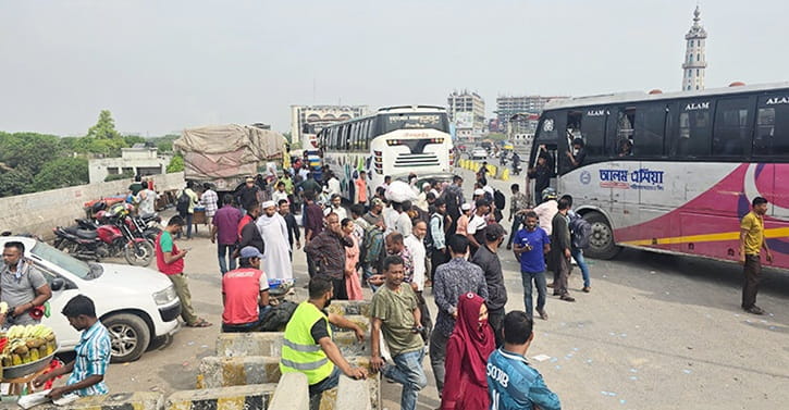 অন্যদিকে ঢাকা-টাঙ্গাইল মহাসড়কের চন্দ্রা ত্রিমোড় ও আশেপাশের এলাকায় যানবাহনের দীর্ঘ সারি দেখা গেছে। নবীনগর-চন্দ্রা মহাসড়কের ওয়ালটন কারখানা থেকে চন্দ্রা পর্যন্ত এলাকাজুড়েই যানবাহন ধীরগতিতে চলছে। সংশ্লিষ্টরা আশঙ্কা করছেন, আজ দুপুরের পর পোশাক কারখানাগুলো পূর্ণাঙ্গভাবে ছুটি হলে মহাসড়কে যাত্রী ও যানবাহনের ভিড় আরও কয়েকগুণ বেড়ে যাবে।