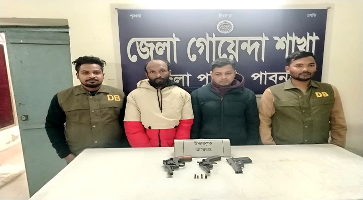 পাবনা ডিবি পুলিশের ওসি রাশেদুল ইসলাম এ তথ্য নিশ্চিত করে জানান, গোপন সংবাদের ভিত্তিতে শহরের মনসুরাবাদ এলাকায় অভিযান চালিয়ে একটি বিদেশী পিস্তল, দুটি রিভলবার সহ চার রাউন্ড তাজা কার্তুজ জব্দ করা হয়। এ সময় দুইজনকে আটক করা হয়।