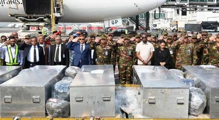 আইএসপিআর জানায়, গত ১৩ ডিসেম্বর সুদানের আবেই এলাকায় জাতিসংঘ শান্তিরক্ষা মিশনের একটি ঘাঁটিতে সংঘটিত বর্বরোচিত সন্ত্রাসী ড্রোন হামলার ঘটনায় শাহাদাৎ বরণকারী ৬ জন শান্তিরক্ষীর মরদেহ শনিবার হযরত শাহজালাল আন্তর্জাতিক বিমানবন্দরে এমিরেটস এয়ারলাইন্সের একটি বিমানে দেশে প্রত্যাবর্তন করে।