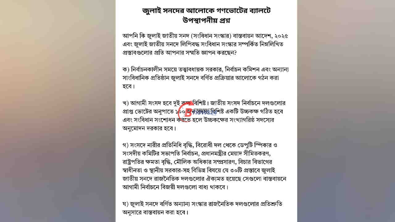 প্রকাশিত খসড়া অনুযায়ী, গণভোটের ব্যালটে ভোটারদের কাছে একটিমাত্র সমন্বিত প্রশ্ন রাখা হবে। সেই প্রশ্নটি হলো: "আপনি কি জুলাই জাতীয় সনদ (সংবিধান সংস্কার) বাস্তবায়ন আদেশ, ২০২৫ এবং জুলাই জাতীয় সনদে লিপিবদ্ধ সংবিধান সংস্কার সম্পর্কিত নিম্নলিখিত প্রস্তাবগুলোর প্রতি আপনার সম্মতি জ্ঞাপন করছেন?