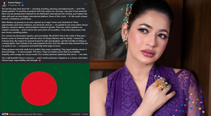 কাজের পাশাপাশি দেশের সমসাময়িক ইস্যু নিয়ে বরাবরই সরব থাকতে দেখা যায় আজমেরী হক বাঁধনকে। বিএনপির ভারপ্রাপ্ত চেয়ারম্যান তারেক রহমানের স্বদেশ প্রত্যাবর্তন ও দেশের ভবিষ্যৎ নেতৃত্ব নিয়ে এবার নিজের ভাবনা প্রকাশ করেছেন অভিনেত্রী।
