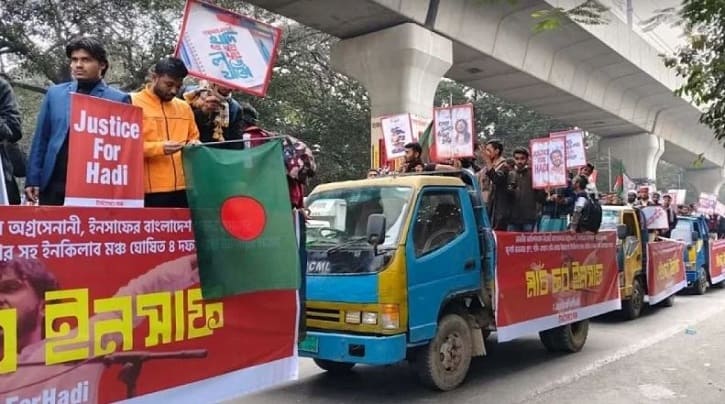 মঙ্গলবার (৬ জানুয়ারি) বেলা সাড়ে ১১টায় শাহবাগের হাদি চত্বর থেকে এ যাত্রা শুরু করেছে। এতে ইনকিলাব মঞ্চের নেতাকর্মীরা অংশ নিয়েছেন।