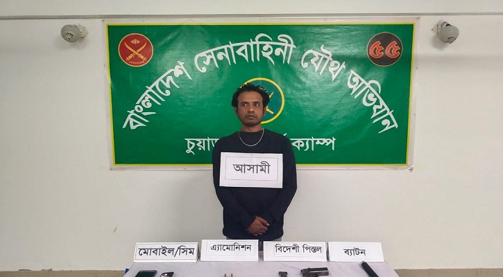 চুয়াডাঙ্গার জীবননগরে সেনাবাহিনী ও পুলিশের যৌথ অভিযানে একটি বিদেশি পিস্তল ও দুই রাউন্ড গুলিসহ গাজী জাহিদ হাসান (৩৬) নামে এক যুবককে আটক করা হয়েছে।